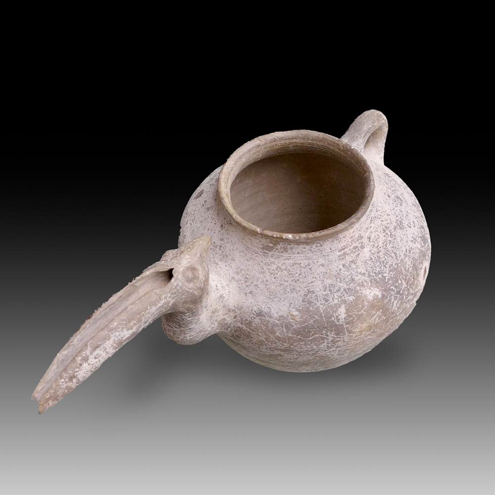 A large ceremonial grey ware libation vessel. Thin walled and smooth surface, the u-shaped spout is decorated with two dots, representing eyes. In profile, the vessel resembles a graceful abstract bird, with the spout as a long beak and curving neck, and the vessel being the body of the bird. Vessels with such a long spout were probably used for ritually pouring liquids in religious ceremonies, in particular in burial rites, although not much about the rituals is known. When filled with liquid, the fragility of the spout and the thin walls made them less suitable for practical purposes in daily life. Persia, Amlash culture, 1100 -900 BC.