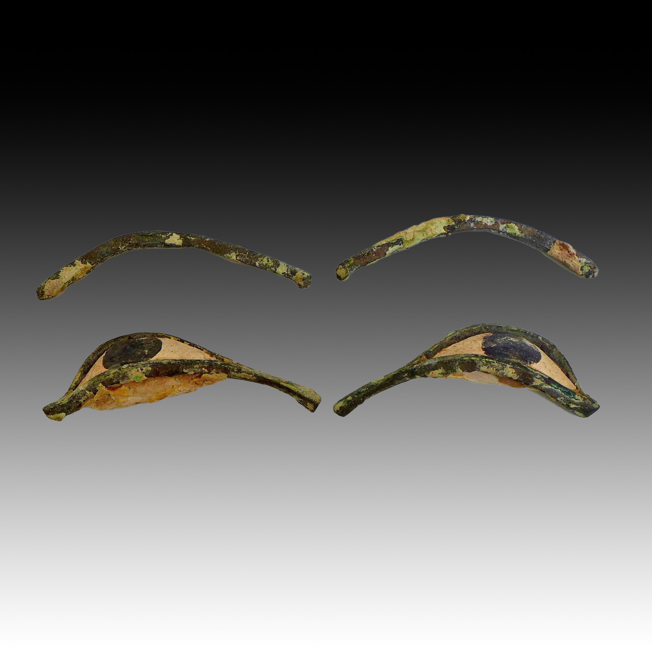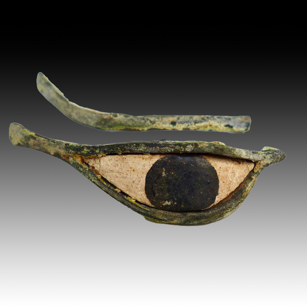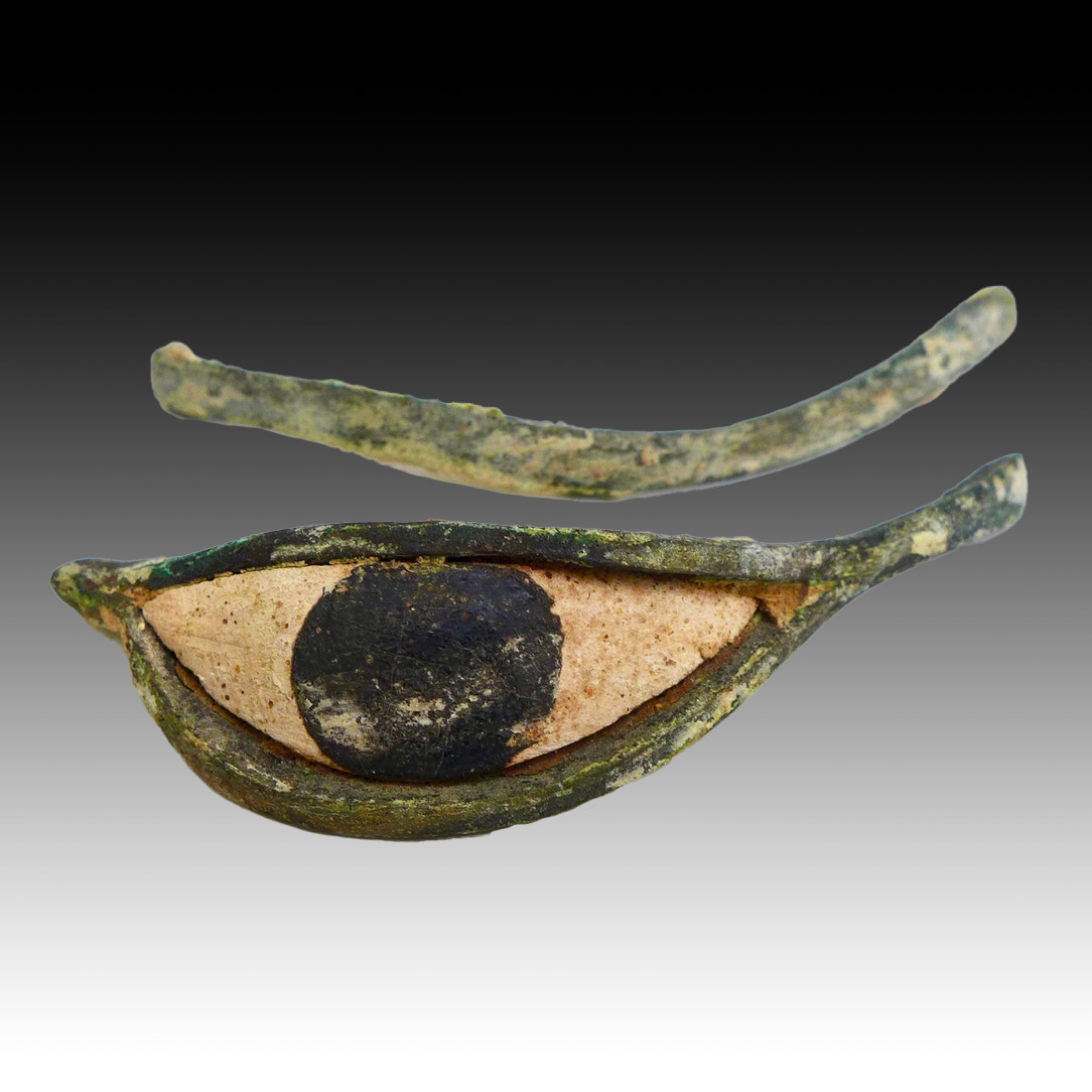A set of bronze sarcophagus eye decoration. Two matching eyes together with their eye brows. Egyptian, 700 – 300 BC. Bronze, limestone and Kohl.