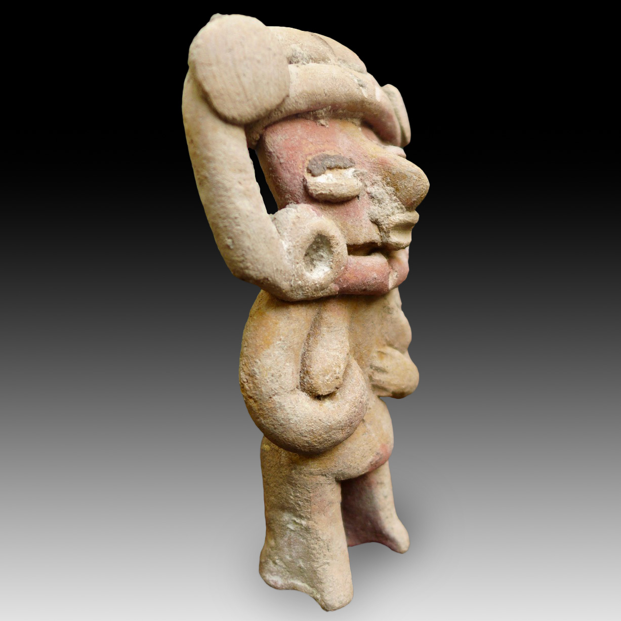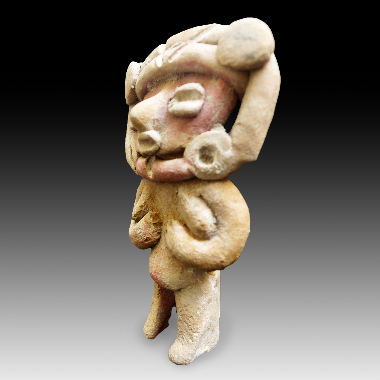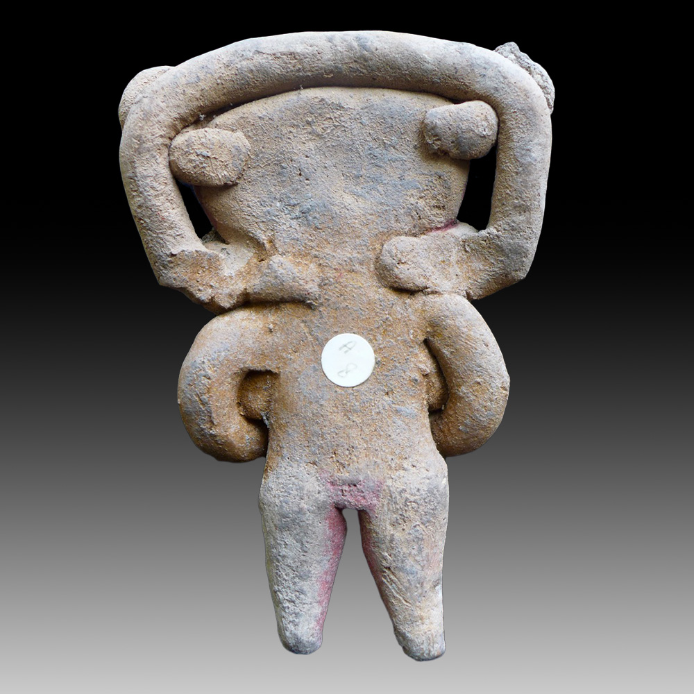 An elegant statuette/idol of a standing nude woman wearing a large necklace and earrings and a large headdress with two buttons. Culture: Chupicuaro, Mexico, dated 800-300 BC. Terracotta with remnants of red and white paint.