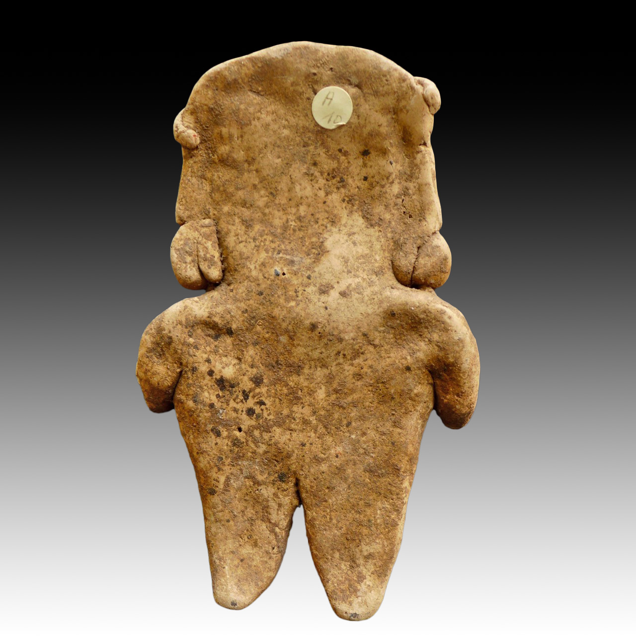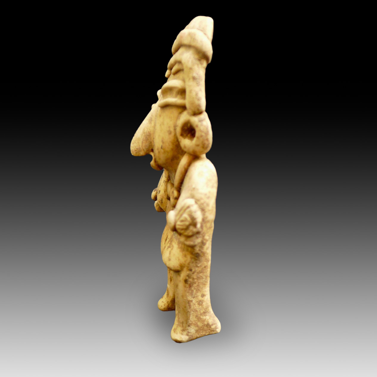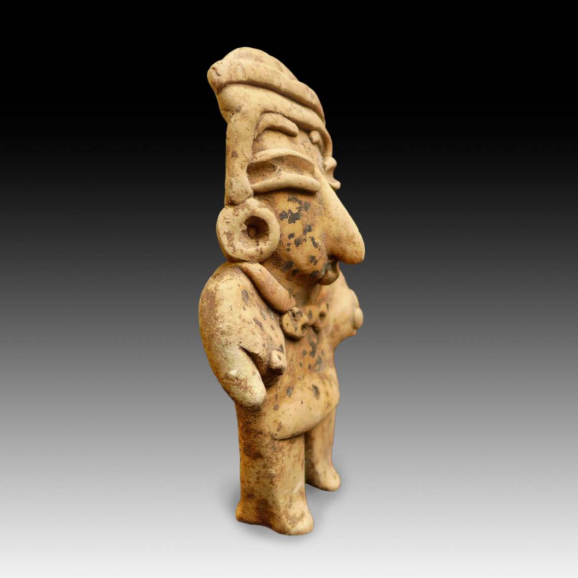 A statue/idol of a large, standing woman wearing a large, important necklace and large earplugs. Culture Chupicuaro, Mexico, dated 800–300 BC. Terracotta with remnants of red pigment on the necklace.