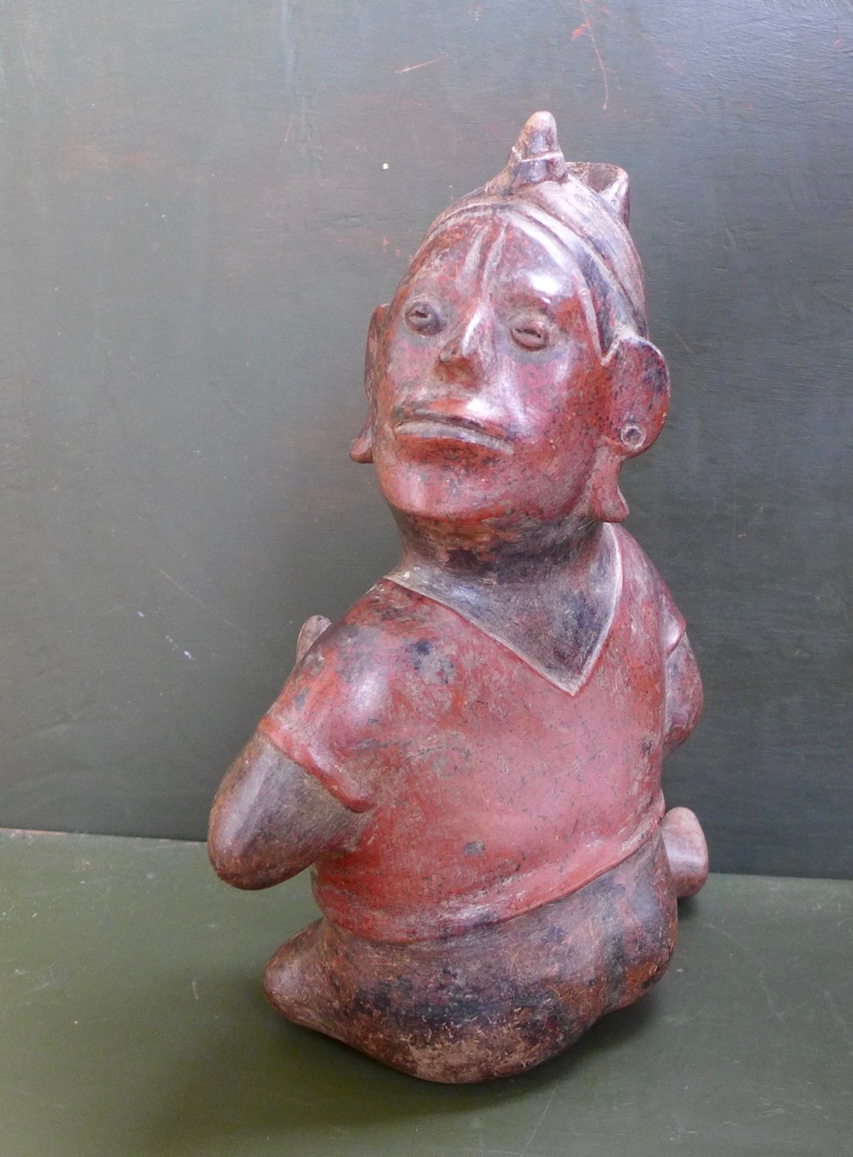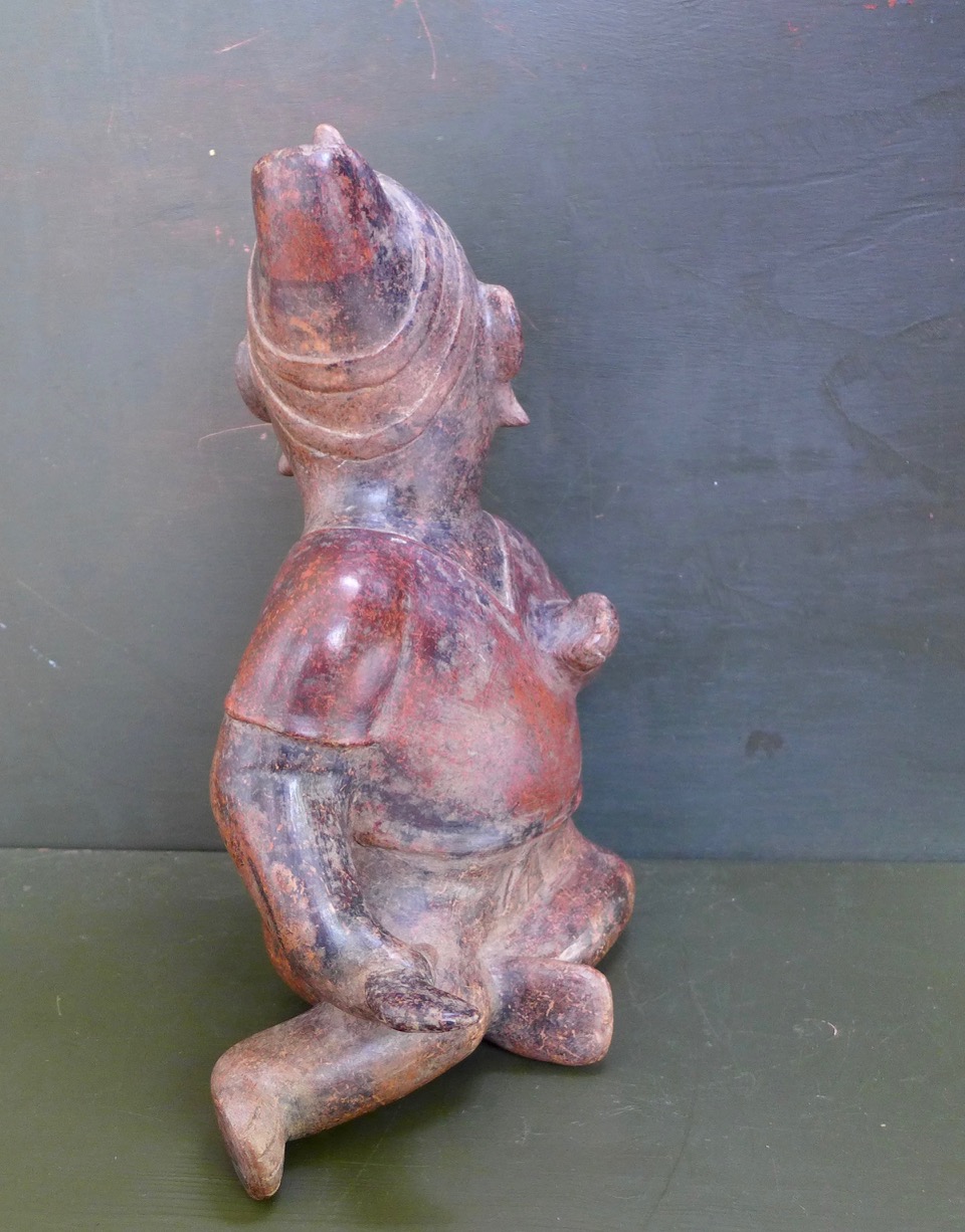 A figure of a praying shaman, in his right hand holding a piece of fruit or a rattle.Terracotta with red and black pigment. West Mexico, Colima. Dated 300 BC to 300 AD.