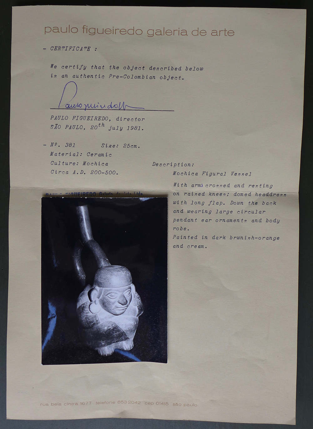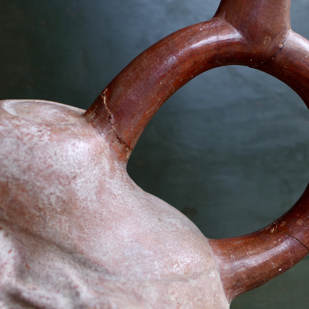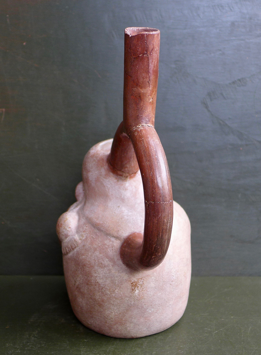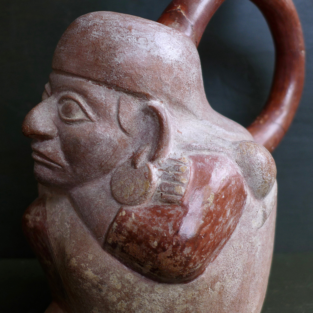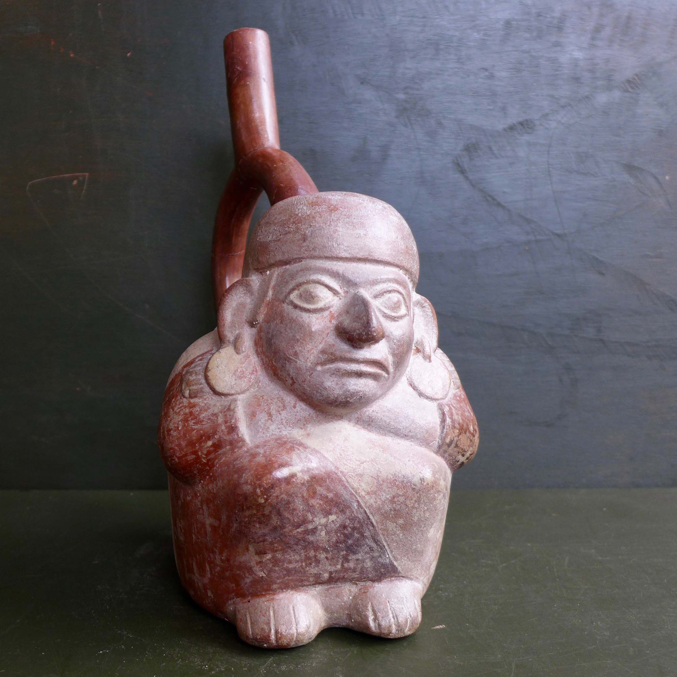 A Moche stirrup spout vessel, depicting a squatting male figure. Arms crossed and resting on his raised knees. Richly dressed in a body robe and wearing ornamental earrings. Painted in a dark brown-orange and cream. North Peru, Moche culture, period IV, approx. 450 AD.