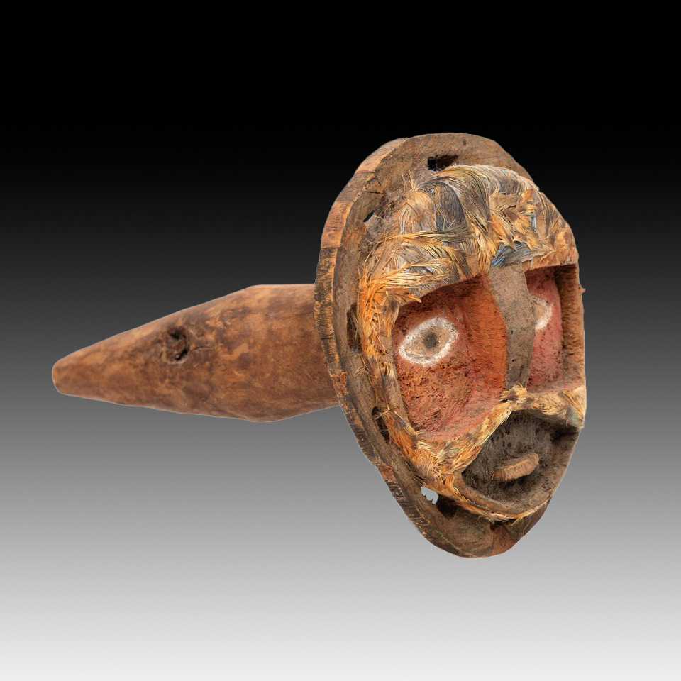 A carved wooden ear plug featuring a stylized human face in high relief, originally polychromed with red and white pigments. The plug is adorned with attached feathers, enhancing its ceremonial and symbolic presence. Such ear ornaments were markers of status and identity in pre-Columbian Andean cultures.