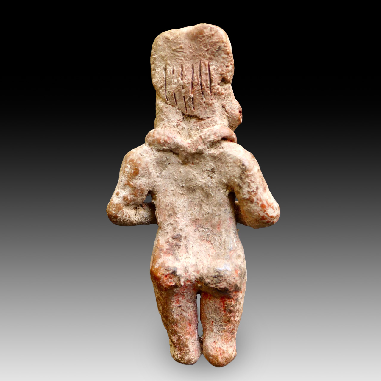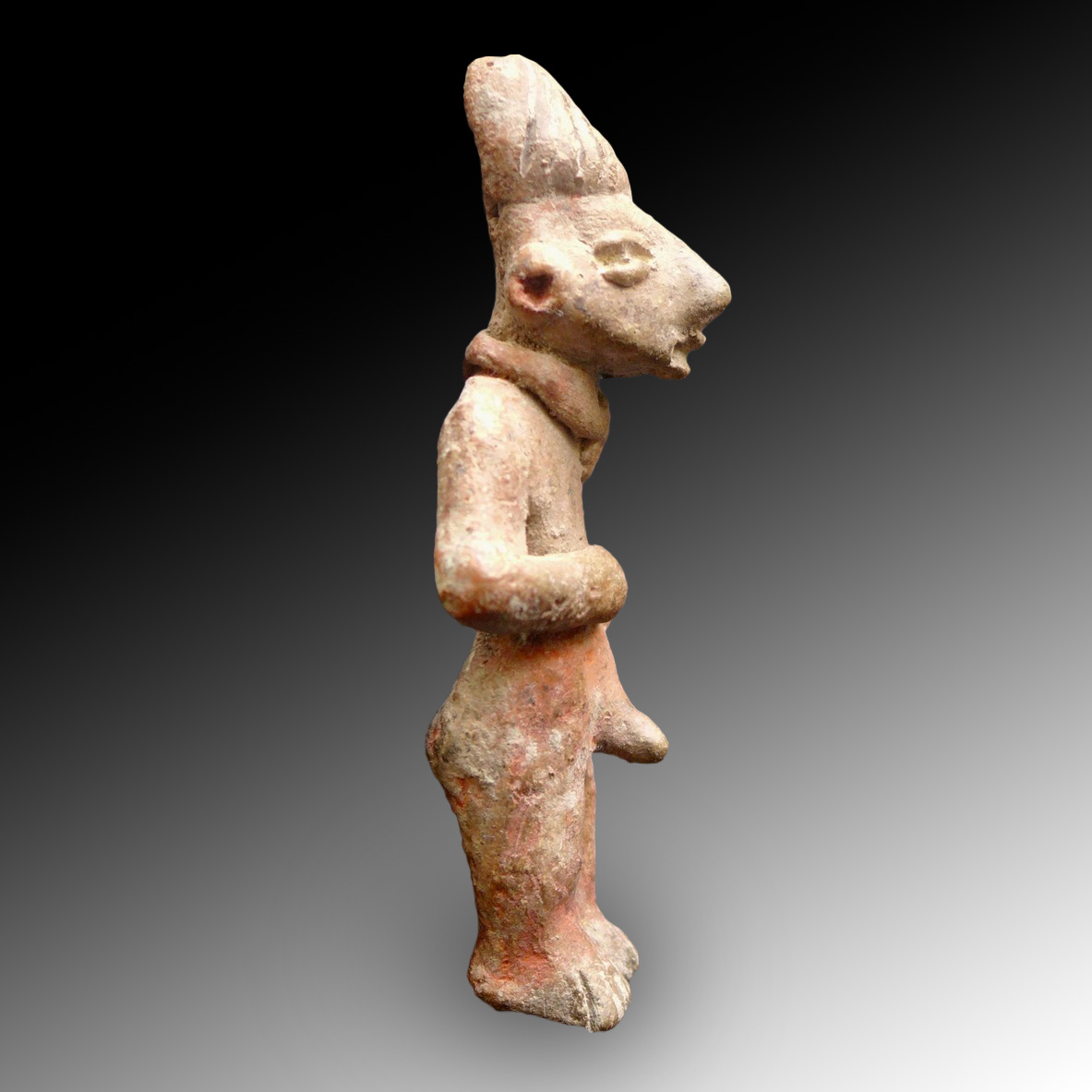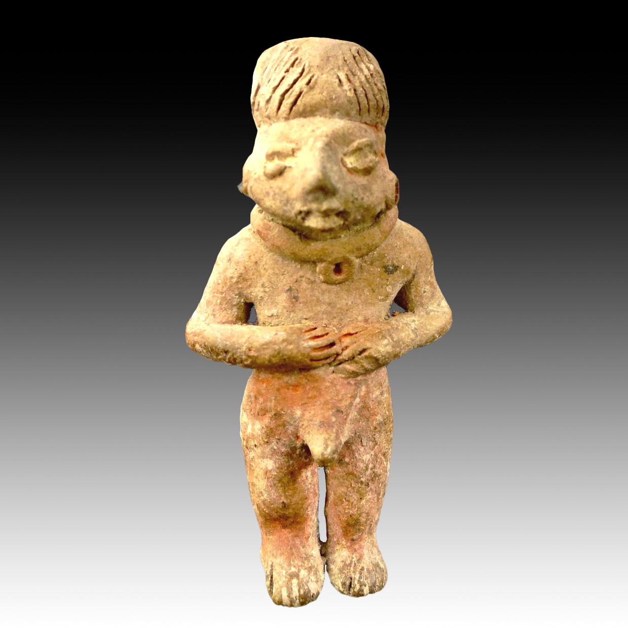 A rare male statue/idol, representing a standing naked man with an erection, he is wearing a large adornment around the neck. Culture: Tlatilco, central Mexico. Date: 1200 to 800 BCE.