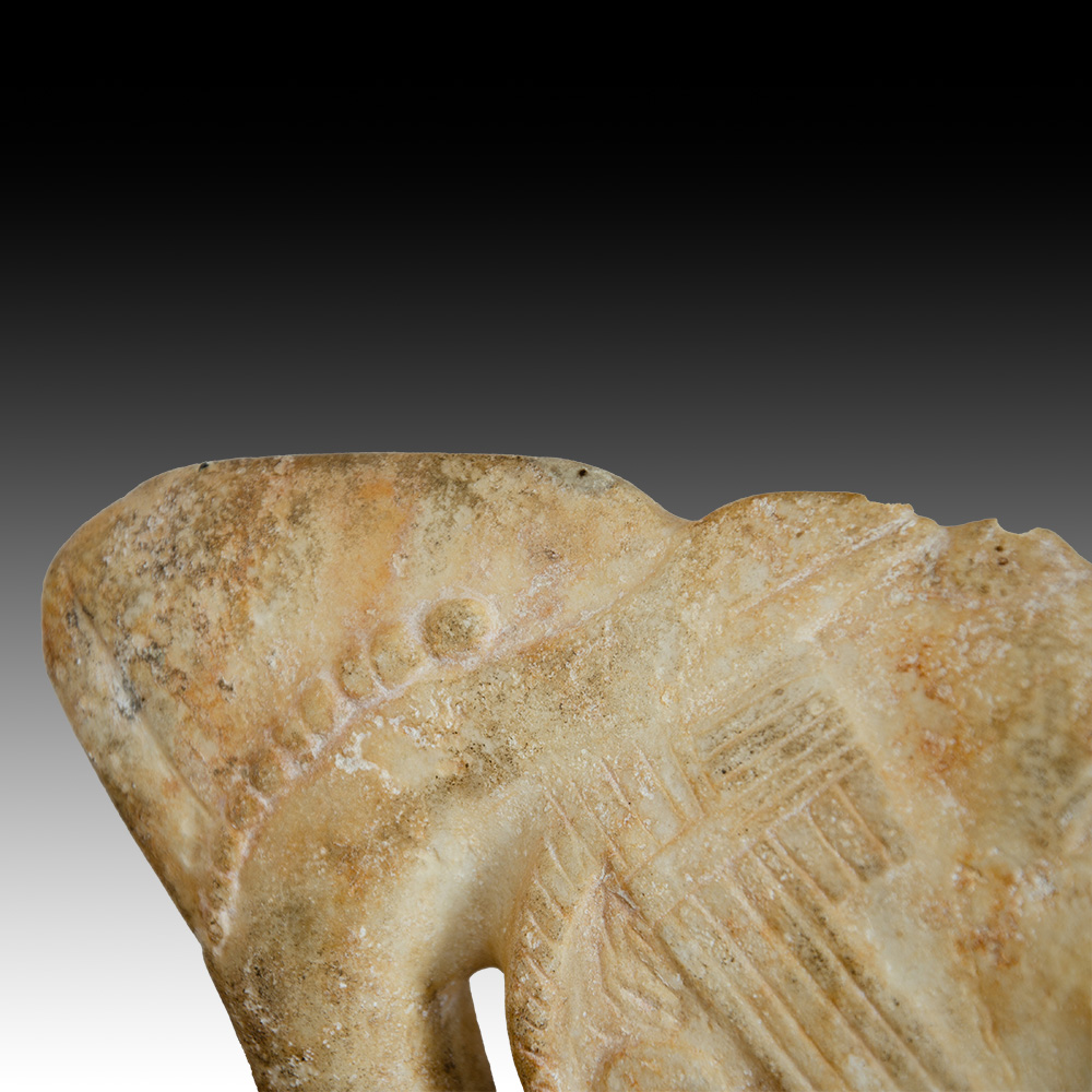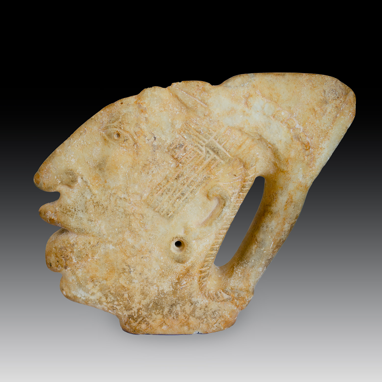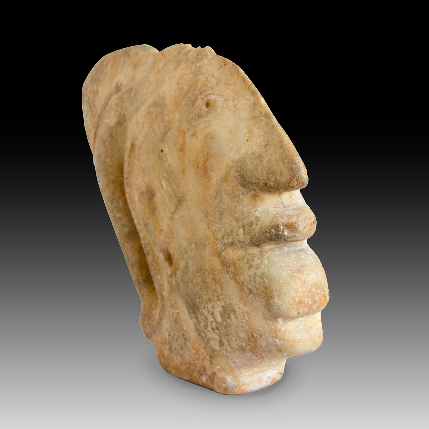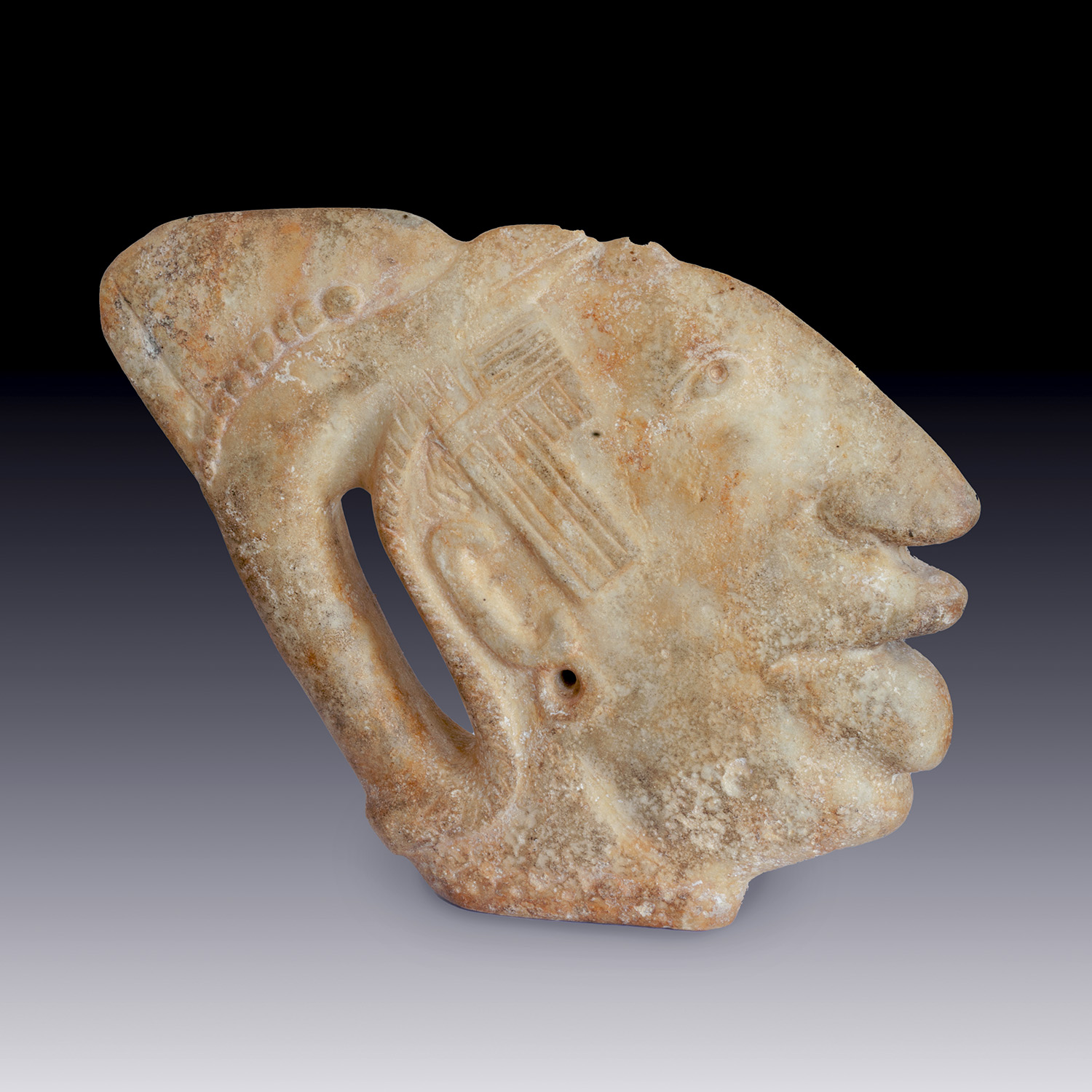 A so-called hache in the form of a human head with a lizard-like animal on the forehead. The object was part of the ceremonial equipment of the ball game. Culture: Veracruz, Mexico. Material: white hard stone, marble-like. Dating: Classic period, 400 – 900 AD.
