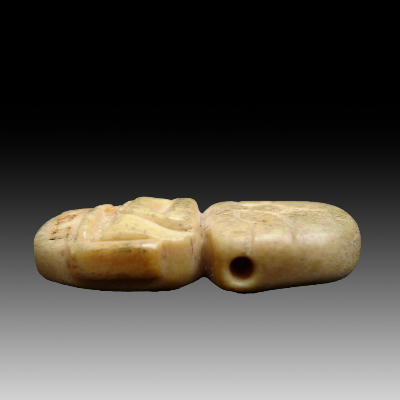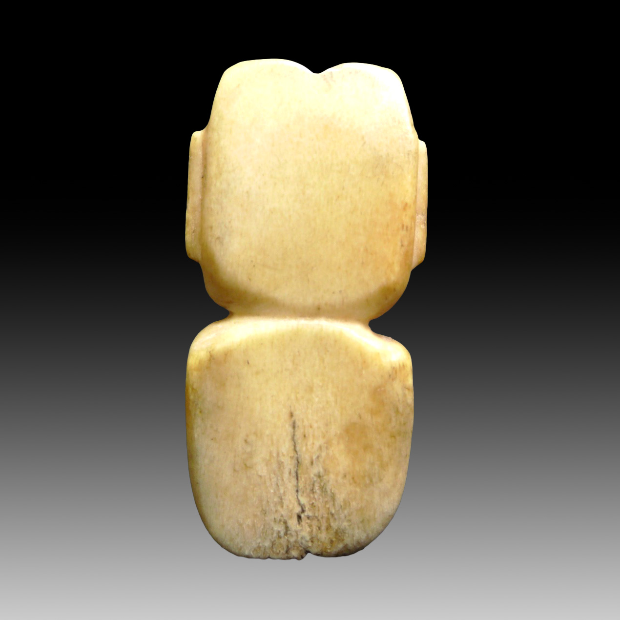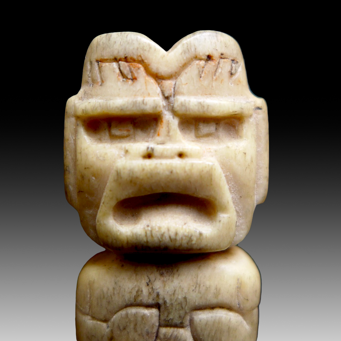 An Olmec  bone amulet or pendant in the form of a human head with thick lips and a feline lower part. Olmec culture, 1200 – 800 BCE. Origin: Mexico, Veracruz. Material: bone.